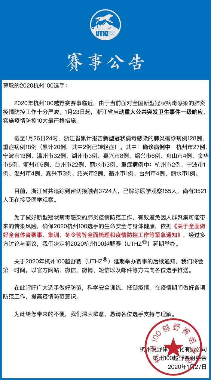 关于延期举办2020杭州100越野赛公告