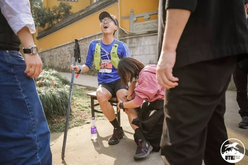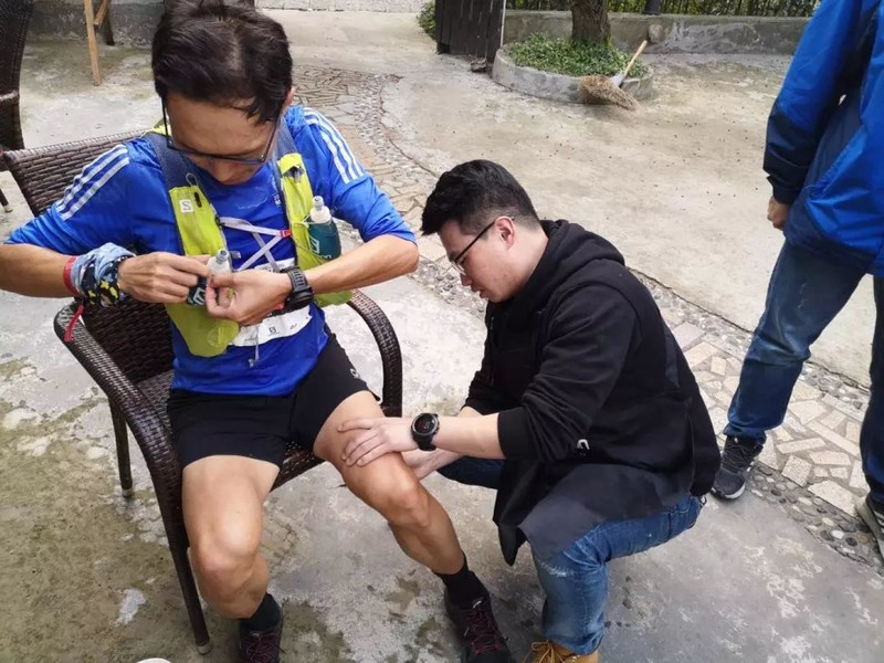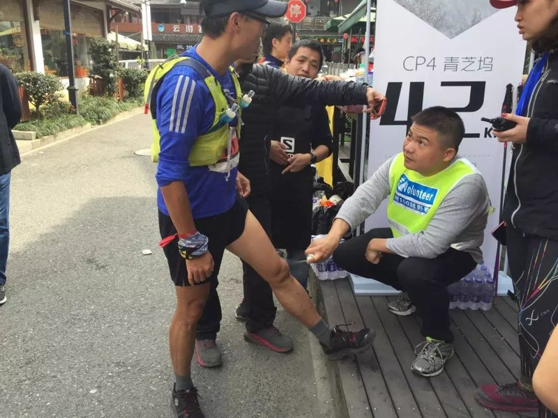 和西安的李斌兄携手(他的膝盖也不好)进了CP4。碰到了杭跑会的老兄弟,顾不上两眼泪汪汪,赶紧呼喊:“喷雾,止痛药,拉伸”。高部长忙前忙后的替我找药,抱病退赛的陈队替我按压,一旁的小姐姐爱惜(还是怜悯?)的看着我。“一半路还没到,髂肌束下坡你吃不消的”,一句话打动我的心。我向来从善如流,更何况是小姐姐的金玉良言,是不是…冷不丁陈队抛出一句:现在第二名就在里面休息,你是第三!!!
