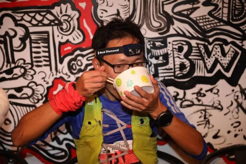 看看路程,还有70多公里呢,好歹先跑到CP3吧。或许,疼痛不再犯;抑或,疼痛会自麻木?胡思乱想间,呲牙咧嘴时,到了CP3。赶紧喊着:有没有喷雾(此后的常规操作)。喷了雾,可爱的大姐强制盛了一碗鸡汤面塞给我。想着要退也要到换装点拿行李,继续吧。
